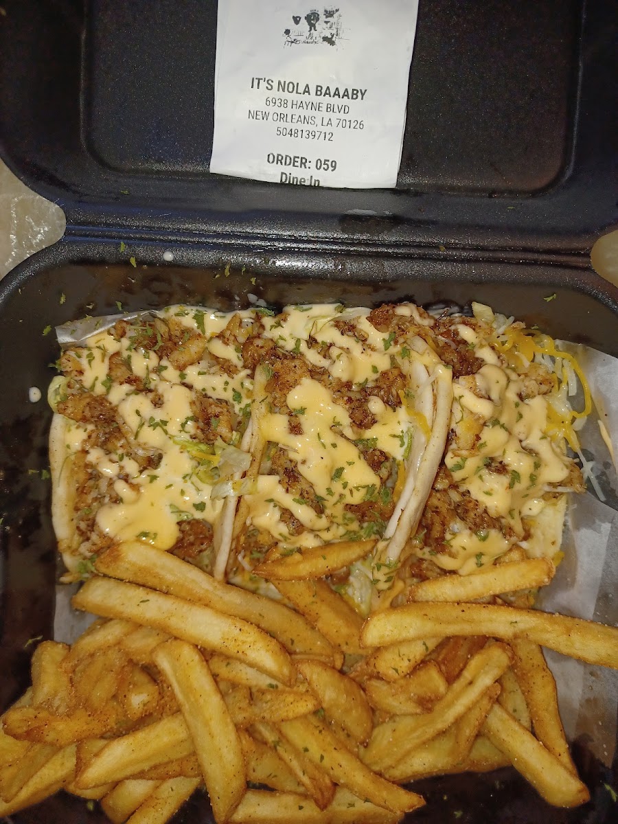 First and formeost Ora was a pleasure and was the individual taking my order. She was so helpful in making my order. I have been wanting to try them for a while and I'm glad my schedule allowed me to stop by and order. I decided on getting the surf and turf tacos and fries. I switched the jalapeño ranch for the Nola sauce just for personal preference. (I'm not a ranch person...but I got it on the side to try.) I also ordered the tropical lemonade w/ added strawberry. Starting with the tacos.... Listen! They were sooo good. They were stuffed to the max with perfectly seasoned ground beef and shrimp (could have used a shrimp or two more cause im greedy like that, lol) I did try the jalapeño ranch and it was definitely a spicy ranch but again, personal preference. I'm ok with my switch to the Nola Sauce. The fries were seasoned well but baby when I dipped it in that Nola sauce, it was the perfect bite. The lemonade was soooo pretty and it tasted like it looked. Definitely going back! What a treat!! I did pay extra for my extra Nola sauce. 2 for $1 and also make sure you have exact change and/ or keep in mind that there is a $1 fee for cards.